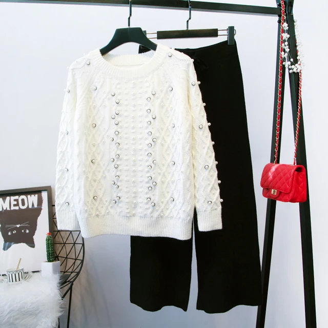 Online - Hot Sale 2018 Spring Cotton Full New Women Two-piece Suit Featuring Fashion With Beaded Knitwear Sweater+ Wide Leg And Trousers Best Price